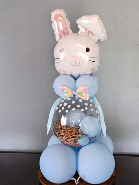 Our Easter Bunny Balloon Surprise Stack is a playful and eye-catching Easter gift. Featuring an adorable bunny balloon topper, pastel balloon accents, and a clear bubble balloon filled with Easter treats and surprises. Finished with soft ribbons and a pastel balloon base, this design makes a fun Easter morning surprise or festive decoration for little ones.