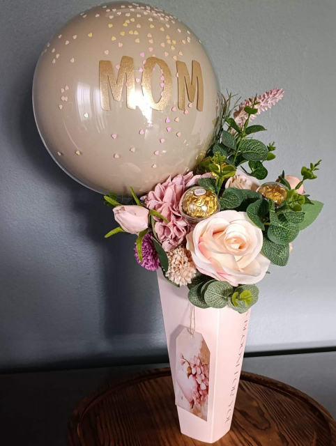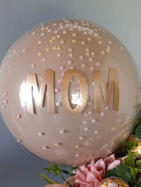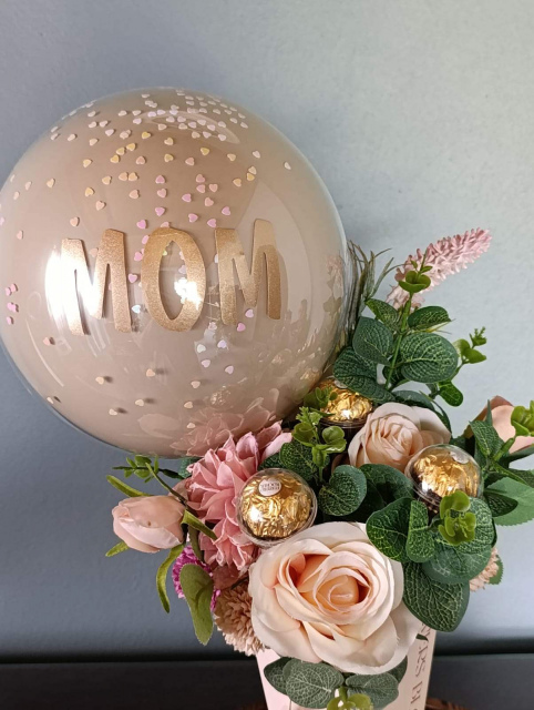 This beautifully curated arrangement features a soft neutral-toned balloon with delicate confetti detailing and “MOM” lettering, paired with a premium floral arrangement in blush and greenery tones. Finished with chocolates for a touch of luxury, this gift is perfect for showing love, appreciation, and gratitude.